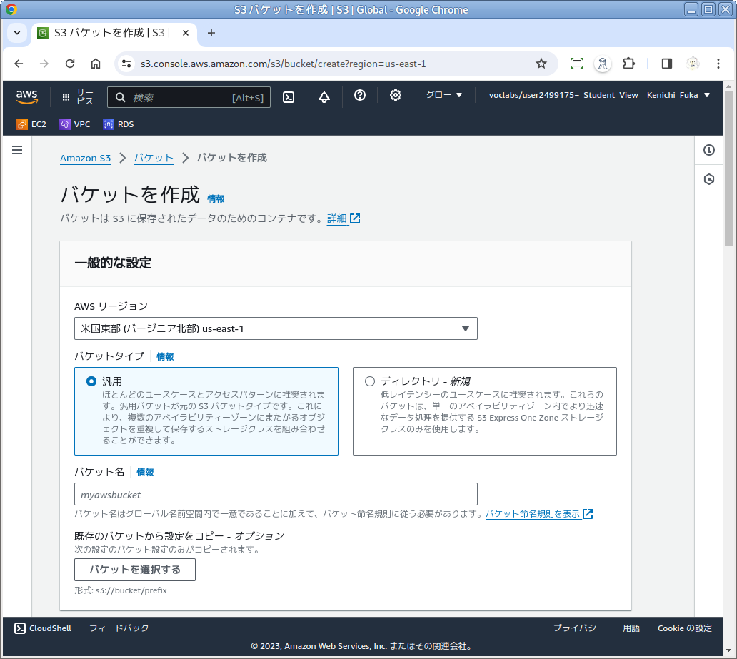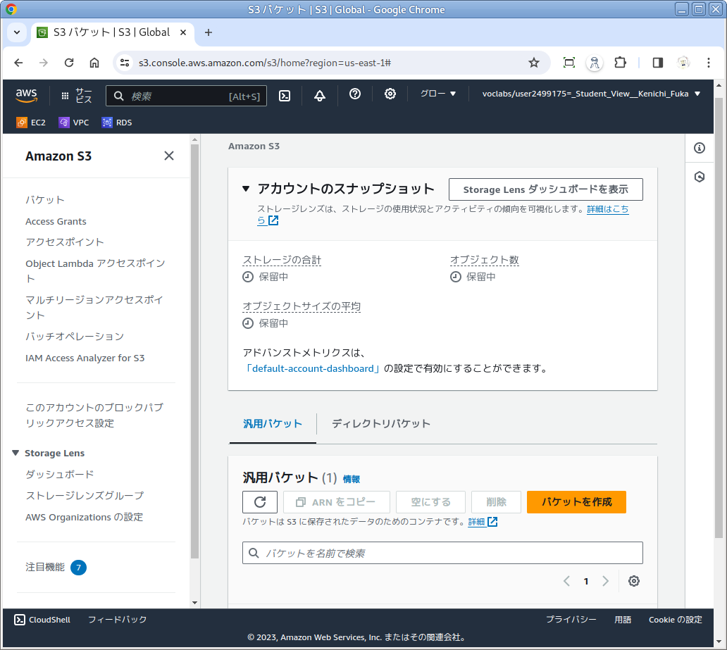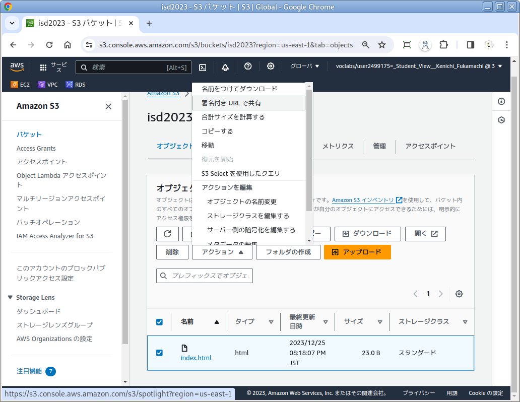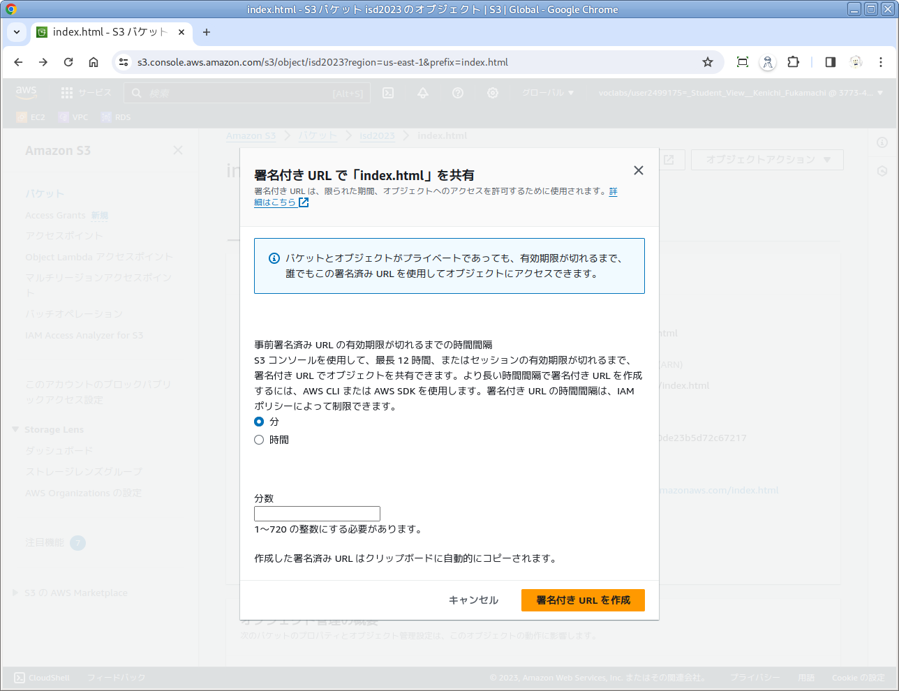 class: compact # <small>第08回おしながき</small> <div class=footnote> <small><small> </small></small> </div> <small> 1. おしらせ - ポータルのパスワード ... gCSj - 授業の録画の再生リスト、ポータルに貼りました。復習にどうぞ - 次回は前半の締めくくりとして口頭試問をする予定です(再掲) - いままでやったことをよく復習しておいてください - sudo python www.py を詳しく説明できるか?が前半のテーマでしたね? - 10月は権限まわりをテーマにしていました - 11月のテーマも復習してね 1. EL (確認テスト) 1. 今回のハイライト 1. AWS S3の使い方のデモ 1. 演習 </small> --- class: compact # <small>第08回のハイライト</small> <div class=footnote> <small><small> </small></small> </div> <small> - 二大ストレージ - ブロック ... 512バイトで読み書き - オブジェクト... ファイルをHTTPSで読み書き(アップロード/ダウンロード) - AWS S3 - HTTPSで読み書きするオブジェクトストレージ - 無限大の容量、eleven 9 の耐久性、(IAMによる)セキュリティ - バックアップ先、災害対策 </small> --- class: compact,center # <small>[実習] S3を体験する</small> <div class=footnote> <small><small> </small></small> </div> --- class: compact # <small>手順</small> <div class=footnote> <small><small> </small></small> </div> <small> - S3 つくる、これはだれでもできるだろう - S3のサイトを作る - 1時間限定でサイトを作るオプションがあるので、それでOK - ガチのサイトを作るのは、けっこう面倒なので、そっちはいいや - S3に適当なindex.htmlをアップロードする - とりあえず学籍番号だけは書いてください(必須要件) - 見栄えを頑張るとかは、おまかせです - S3のサイトを作れたことをTAさんに確認してもらう - URLを申請するフォームを作るので、それで申請する(?) - 確認されたら、画面に確認が終わった学籍番号が反映される(?) </small> --- class: compact # <small>課題</small> <div class=footnote> <small><small> </small></small> </div> <small> - 【課題】 - 冗長構成なショッピングサイトを作る際にS3を使う案もある。 - (もちろん最終課題の設計を念頭においています) - どういう使い方をするべきか?を考えてください。 - また、他のAWSサービスに適切なものがあるか?も調べてください。 もしそういったサービスが存在するなら、それらのサービス群を、どのように使い分けるのがベストプラクティスだろうか? - portal のレポートボックスで提出してください /small> --- class: compact,center # <small></small> <div class=footnote> <small><small> </small></small> </div>  <!-- section-begin aws.s3.create.bucket --> --- class: title, smokescreen, shelf, no-footer # 【付録】AWS S3バケットの作成 <div class=footnote> <small><small> </small></small> </div> --- class: compact # AWS S3とは? - Google Driveみたいなもの - 一般には、Google DriveやAWS S3のことをオブジェクトストレージと呼んでいます - 第9回の講義で少し話します - 用語が違うので、ここは覚えること - バケット(Bucket) ... Google Driveの一番上の階層のフォルダみたいなもの - オブジェクト(Object) ... Google Driveの各ファイルのこと --- class: compact,img-right # S3バケットの作成(1)  - AWS consoleでS3を探してクリック - <B>画面右下のオレンジの「バケットを作成」</B>をクリック(右図) --- class: compact,img-right # S3バケットの作成(2)  - 「バケットを作成」画面(右図)で - <B>バケット名</B>をつけます - バケット名は<B>学籍番号</B>にします - それ以外の設定はデフォルトのまま - (縦長の画面なので、だいぶ下にスクロールして) 画面右下のオレンジの「バケットを作成」をクリック(右図) - 最初の画面(前頁の図)に戻るので、 下の方に作成したバケット名があることを確認してください <!-- section-end aws.s3.create.bucket --> <!-- section-begin aws.s3.enable.www --> --- class: title, smokescreen, shelf, no-footer # <small>AWS S3のファイルをウエブ公開(時間制限付)する</small> <div class=footnote> <small><small> </small></small> </div> --- class: compact,img-right # AWS S3のファイルをウエブ公開(時間制限付)する(1)  1. S3の管理画面に入り 1. バケットを選んでクリックすると 1. 「オブジェクト」という画面になります。オブジェクトはファイルです 1. 公開したいオブジェクトを選択し、 1. 「アクション」で「書名付きURLで共有」をクリックします (右図) --- class: compact,img-right # AWS S3のファイルをウエブ公開(時間制限付)する(2)  - 時間を設定して、 - 「分」か「時間」を選び - 「分数」欄に数字を設定します - 右下のオレンジ色の「署名付きURLを作成」をクリックしてください - 生成されたURLは、自動的にクリップボードにコピーされます - 動作確認 - ブラウザでクリップボードのURLへアクセスしてみてください <!-- section-end aws.s3.enable.www -->